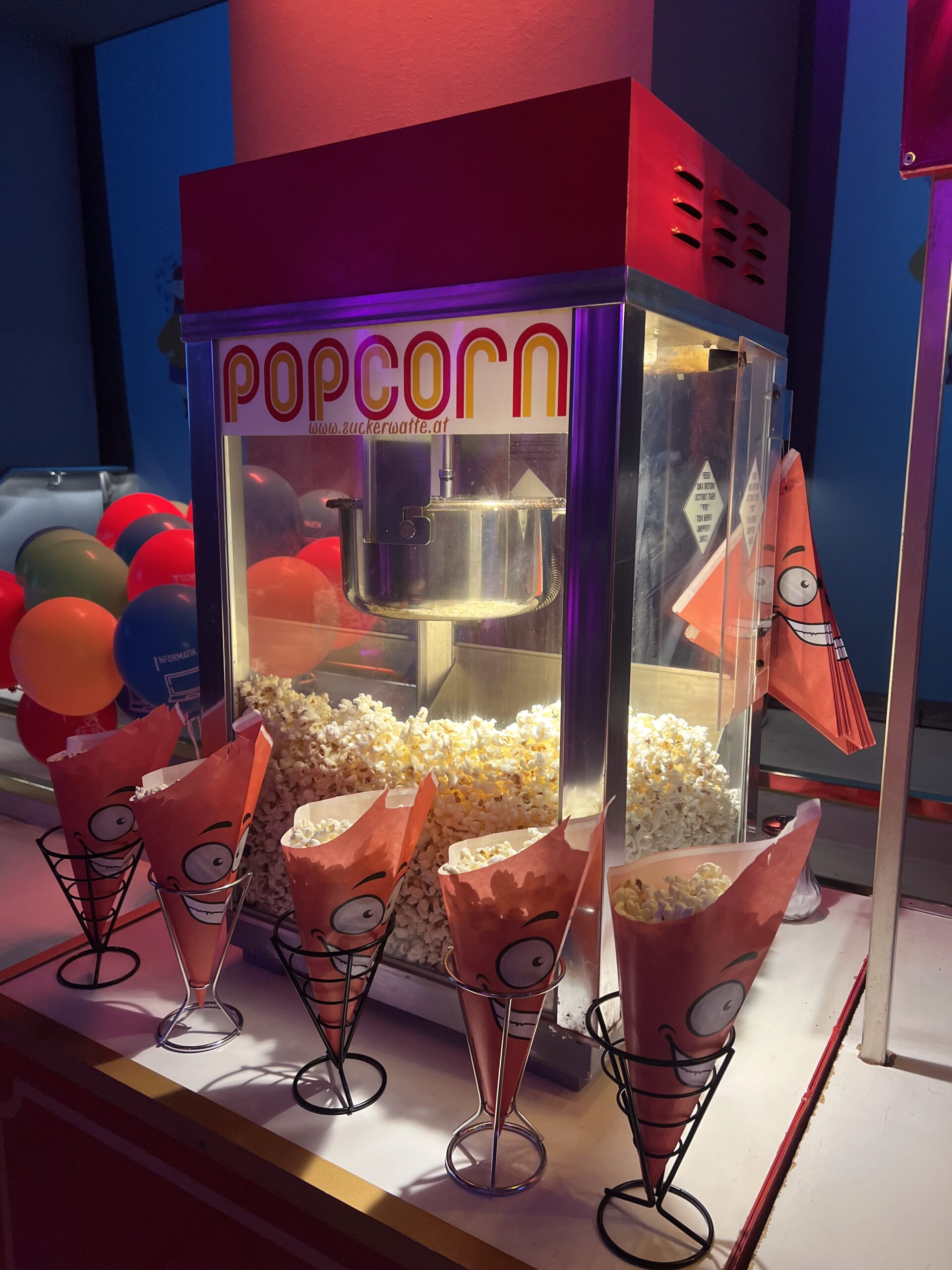 Zusätzlich können Sie auch unseren passenden Popcorn-Stand mieten und ihre Kunden, Angestellten, Kollegen etc. mit frisch gerösteten Popcorn verwöhnen!